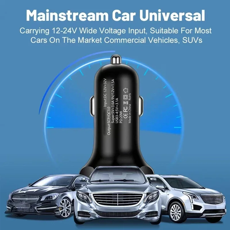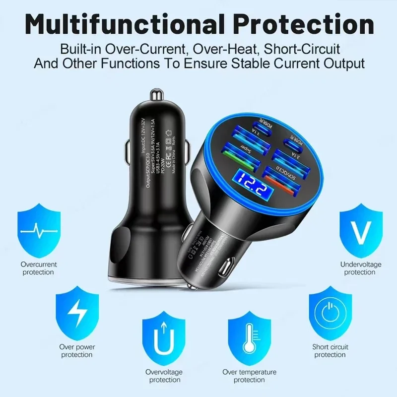 Adaptateur de chargeur de voiture USB C, charge super rapide avec moniteur de tension, 4 USB A et 2 PD, iPhone, Samsung, Huawei Vivo, OPPO, Oneplus