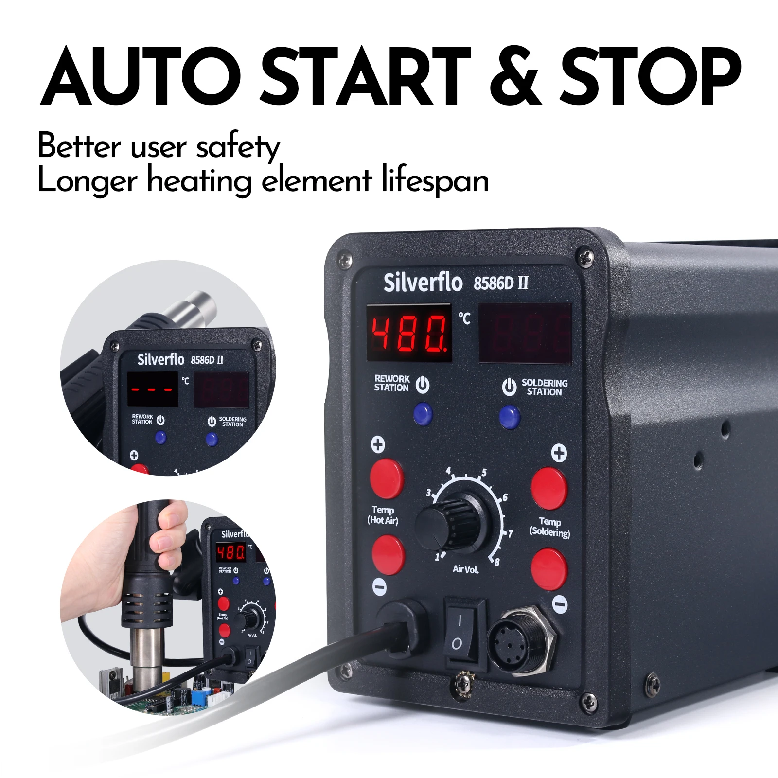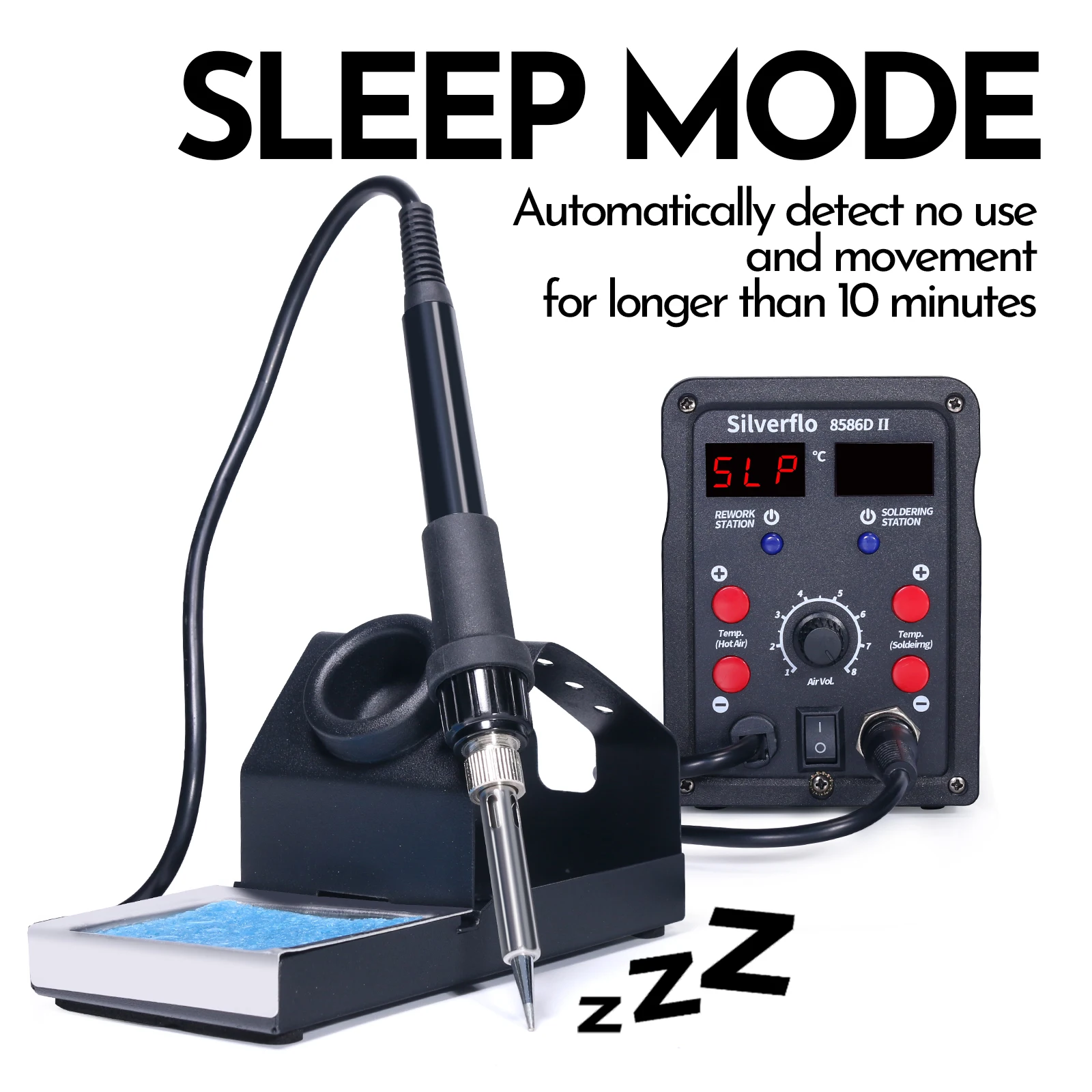 Mode veille de 2.10 minutes.La station détecte automatiquement son propre état de fonctionnement, et lorsque la station ne détecte aucune utilisation et aucun mouvement pendant plus de 10 minutes, le fer à souder passe en mode veille. Cela pourrait effectivement empêcher la